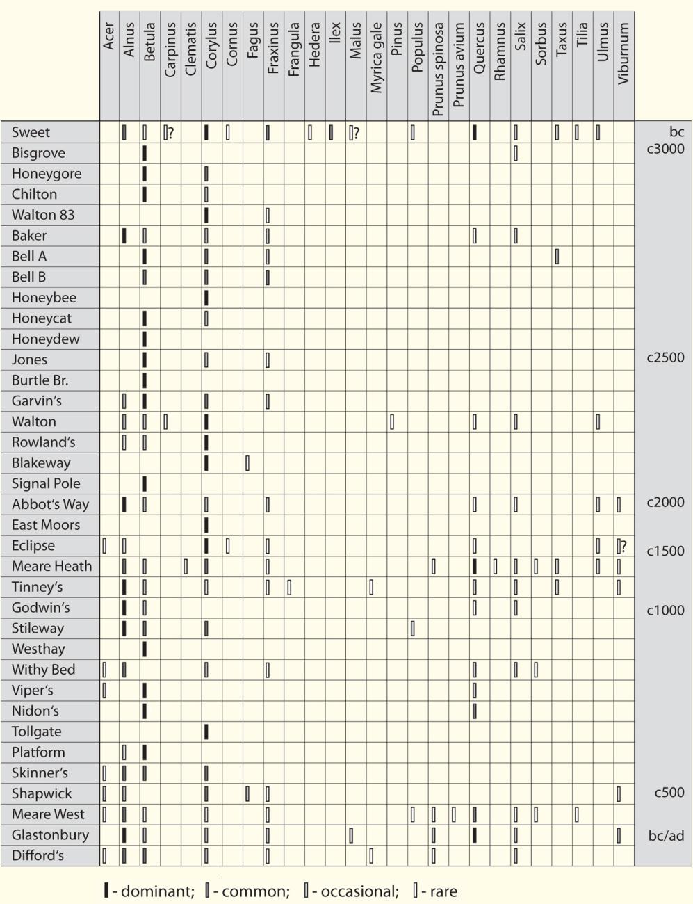 Among the many archaeological structures and other discoveries in the Levels, 36 sites can be extracted which provide a useful guide to the woods selected over circa 4,500 years (circa 4,000 BC - AD 500) (Table 1). From these sites we can identify 26 species of wood actually used in the constructions (Orme and Coles 1985). The age, size and condition of the different species can be measured, and other studies can indicate the nature of woodworking tools used and the quality of woodworking. Primary forests, previously untouched by man, are also indicated in the record of pollen preserved in the peat beneath the earliest structures. It is apparent that a wide range of tall and ancient trees, such as oak, ash and lime, existed in this 'wildwood' for utilisation circa 4,000 BC. By circa 3,000 BC, managed woodlands containing coppiced hazel had been long established, and these were still in existence by circa 2,000 AD. Regenerated forests were heavily exploited circa 1,500 BC, but yielded timber mostly of inferior size and quality to those of the primary forests. After circa 500 BC, oak woodlands were diminished and a wider range of trees was being used.