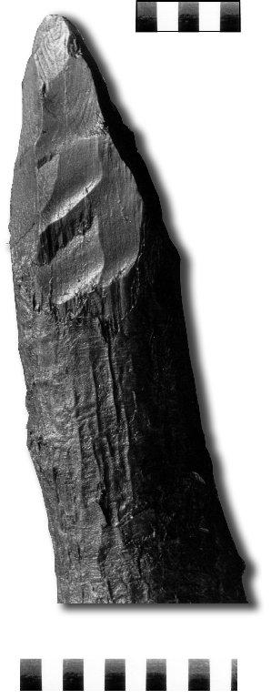 Many thousands of pieces of roundwood from the Levels bear clear axe-marks, or facets, and some have evidence for the shape of the blade used (See Fig 2). Where the blow carried through, a facet is left. Experimental work has shown that the number of facets on a piece bears little relation to the number of blows used in working the wood. In recent experiments, as many as 50 or more accurate chops with a stone or bronze axe would produce a sharpened stake but the artefact would bear only 5 or 6 identifiable facets or axe-scars, the others truncated or lost by the sequence of action. This in a way is the same as retouch on flint, where many of the first flake scars are lost. Particularly useful are occasions where the axe head bit into the wood and had to be pulled clear, without necessarily detaching a chip, leaving a mark of the cutting edge which may survive and identify the blade. Clear marks of this sort are often present on Bronze Age wood but not on the Neolithic. And sometimes where the blade has been damaged in use or in casting, it leaves a 'signature' on the wood, generally a small ridge or set of ridges on each facet produced by that blade; the potential correlation of worked pieces is obvious.