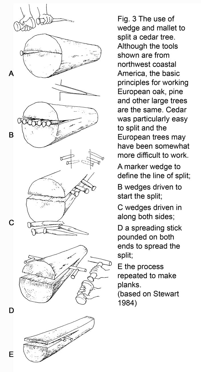 The tools needed to convert a fallen tree into timber are wooden wedges and a mallet or beetle. The process of such timber production is simple and well-understood, but in practice it is often different from its theory. By driving wedges to exploit the basic lines of wood structure, stems can be split, and some woods such as oak and cedar are thus easily reduced (See Fig 3), other woods are more intractable. Where knots and branches exist on a stem, the wedge and beetle technique will be less easily applied. Our experimental work, however, has demonstrated the effectiveness of wedge-splitting on a variety of woods in different conditions.