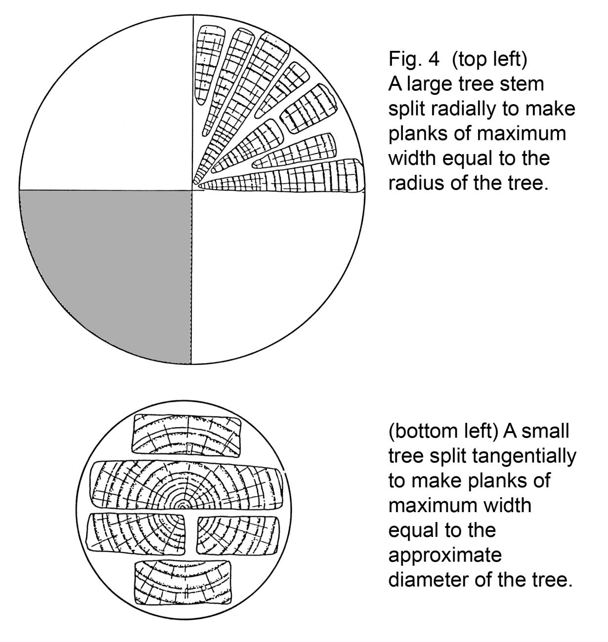 From the start of our record both radial and tangential planks are found, with a few split diagonal to the rays and some straight through the middle of the tree (See Fig 4). Different approaches to splitting the trunk are required for these different types. Radials, the most common type of oak plank, can be produced by splitting a trunk in half and half again and then splitting 'slices' off each quarter. Tangentials require carefully controlled splitting across the natural planes of weakness in oak, and are perhaps easier to produce in ash which has no rays and splits more readily along the growth rings (See Fig 4). A plank split across the centre of a trunk is effectively what is left when a tangential plank has been taken off opposing sides of the trunk.