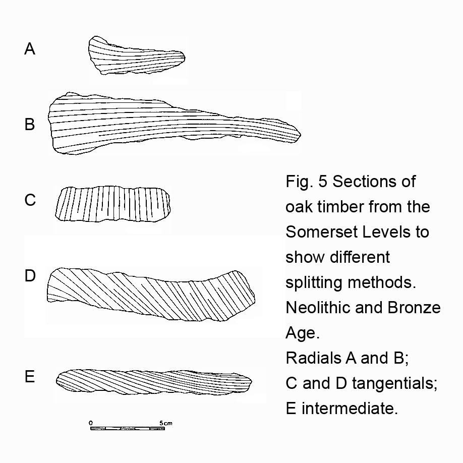 The Bronze Age examples range from redirected radials to true tangentials. The pieces intermediate between radial and tangential are split across the primary natural planes of weakness in oak, namely the rays, and across the growth rings which can also allow easy splitting. Theoretically, these examples are the most difficult to produce, yet they are found in both Neolithic and Bronze Age structures. The true tangentials are relatively small timbers, and may have been produced by secondary splitting of a hefty radial. Lime tree-ring samples provide some information about the working of this species in the Early Neolithic; they appear to be rather thick tangentials split in two down the centre, and true tangentials have been recorded.