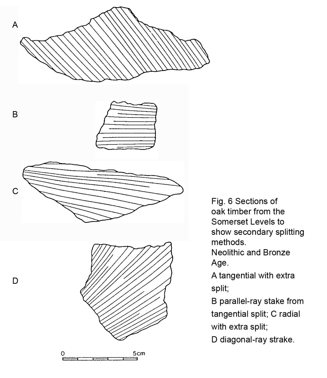 Four categories of secondary splitting have been distinguished (See Fig 6), one of which, the radial with extra splitting, may overlap with the redirected radials discussed above. Some pieces, however, cannot have been produced in the single operation of detaching timber from trunk, and they include results best described as parallel-ray, diagonal-ray, or tangential with extra splitting.