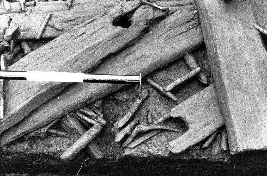 The evidence surviving from the Levels allows some observations to be made about the felling of trees, and in the use of different axes of stone, bronze and iron. It is very unusual to recover any direct evidence of the felling operation itself. However, tree-stumps occasionally survive in the Levels‘ peats, and show the precise method of felling, e.g. very acute chopping, around the whole stem, marks the felling operation on yew circa 1,500 BC. The chopped ends of stems and branches are less reliable as they may have been re-worked after felling. Timber burnt at one end may suggest the use of fire to assist in felling, but only if, as in the Levels’ evidence, the wood was not being re-used from earlier structures. Because trees once felled were most often cut to shape, it is only the rather rough substructural components that preserve traces of the felling operation.