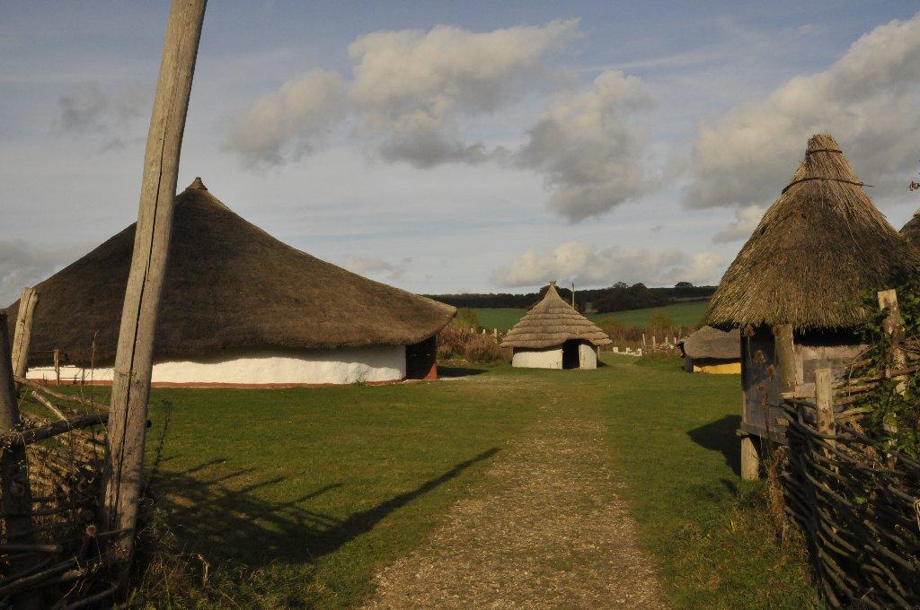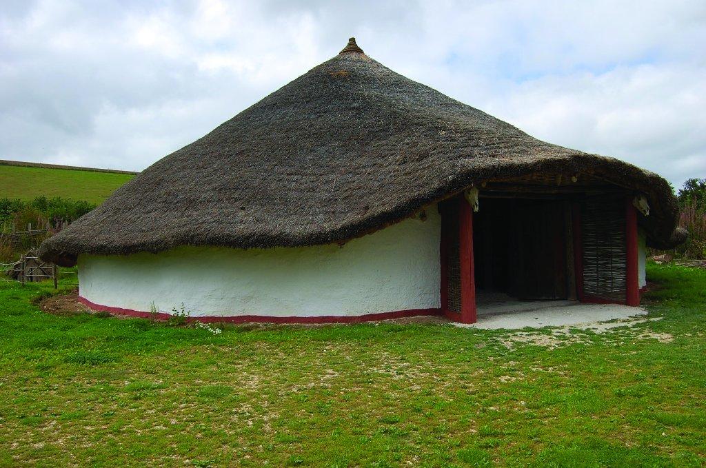 The Iron Age enclosure contains a number of structures. There are four completed roundhouses which are all based on excavations in Britain. The largest house, the Little Woodbury, was excavated by Bersu in the late 1930s on the outskirts of Salisbury. It is 50 feet in diameter and has been constructed using oak posts, ash rafters, hazel wattle and purlins and wheatstraw thatch. The walls were daubed and lime-washed and designs have been added with metal oxide pigments.