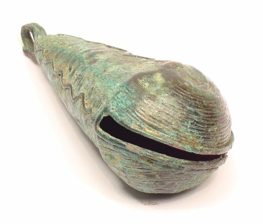 One can see the cord that descends from the base of the suspension ring to the opening of the design, and that functioned as both a decorative element and a secondary smelting channel. Also visible is the smooth face of the interior of the piece, evidence of the texture of the surface of the clay core upon which the bell was modeled.