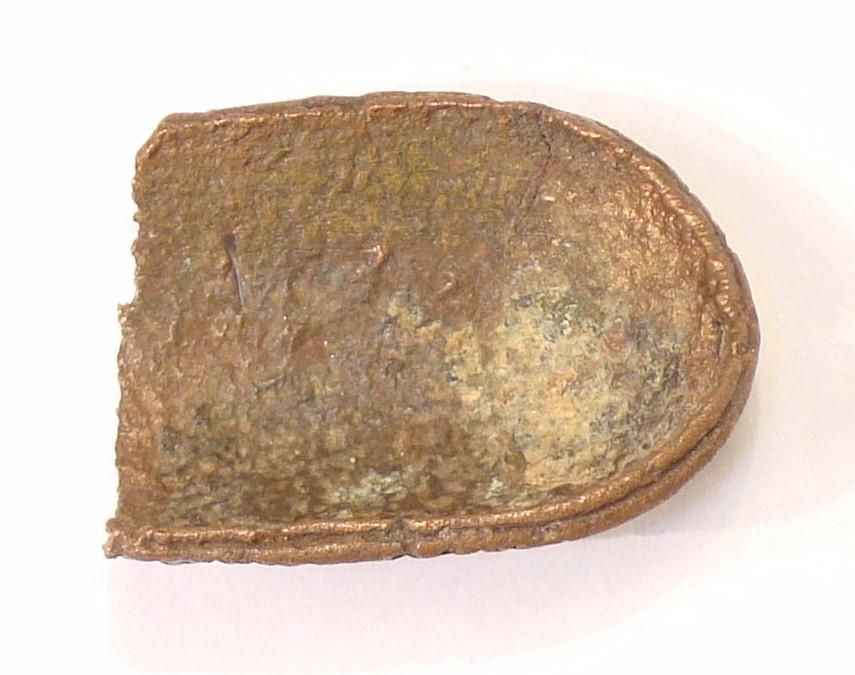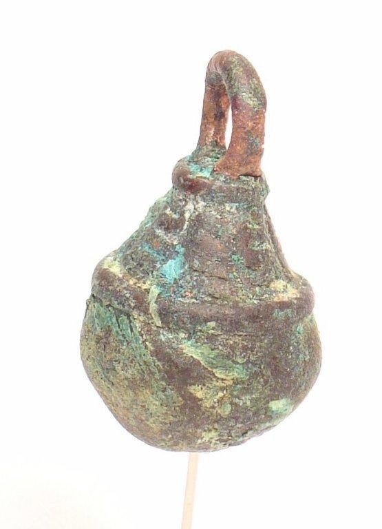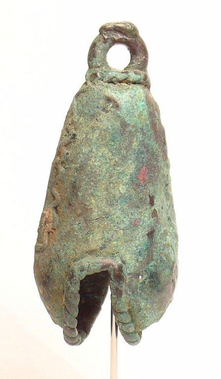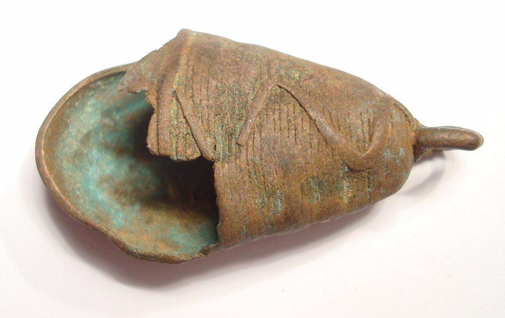 Fig 22. Smooth surface bell formed by flattening the wax cords. The suspension ring of this design shows the connection with the smelting channel. Also, there is evidence of a flaw in the smelting process that left one part of the opening filled with metal.