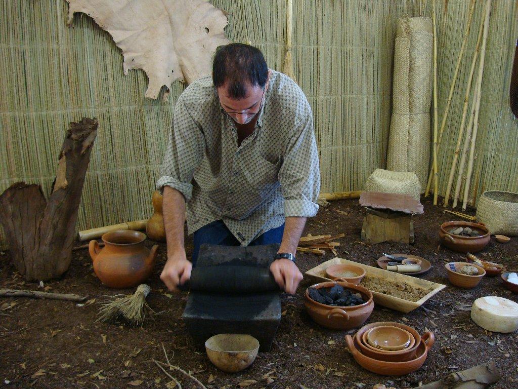 Fig 23. View of the experimental design based on information from the Códice Florentino; charcoal grinding using a stone metate.