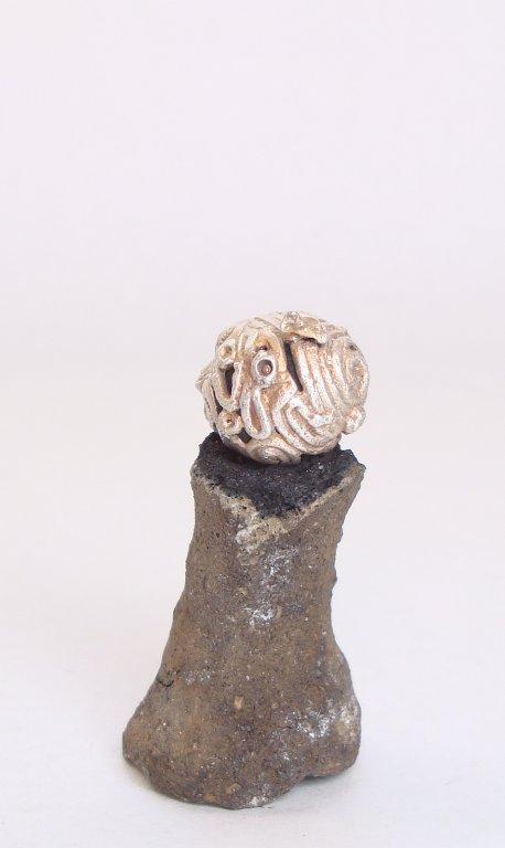 Fig 9. Cord decorated bell; the spiral-shaped suspension ring is visible, as are two stone clappers in the interior.