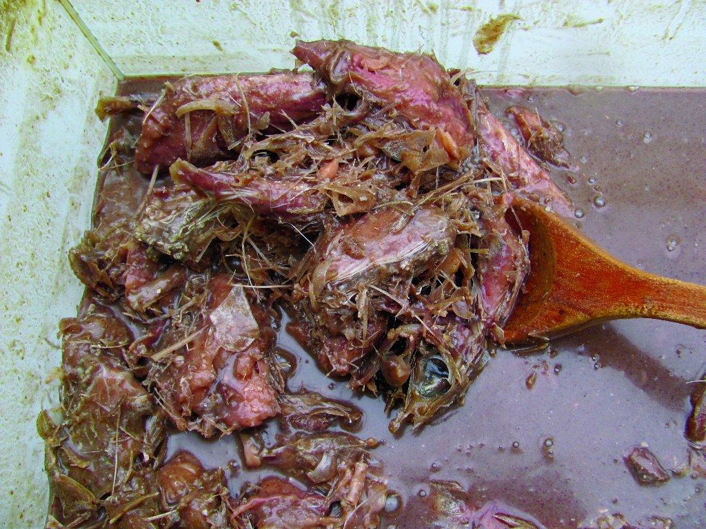 In 2011 a new experiment was conducted using mackerel cut into pieces, exposing the viscera and additional liquid using a reversal of the ratio in the recipes for example 2 fish: 1 brine. The mackerel liquefied quickly and generated a large quantity of sauce but did not fully liquefy all the muscle tissue as flesh remained attached to many of the pieces of fish. (See Figure 4 )