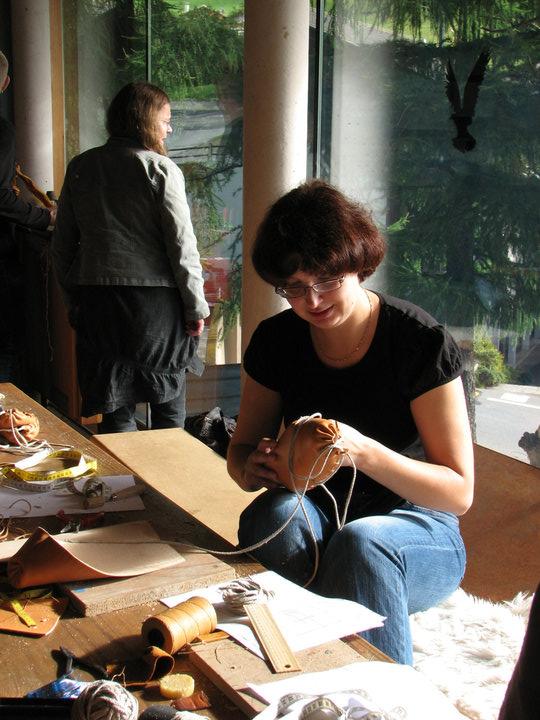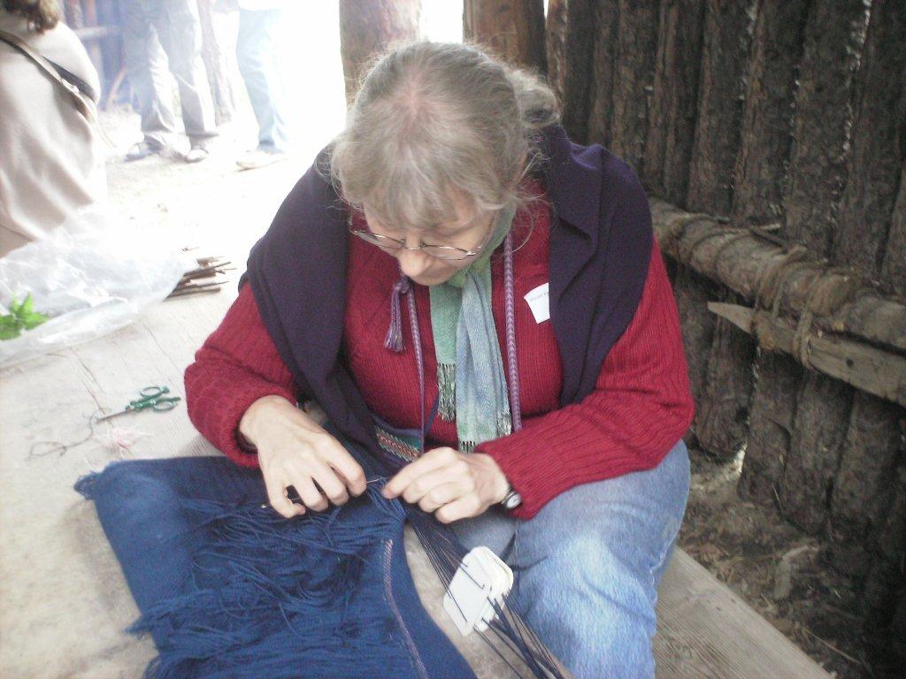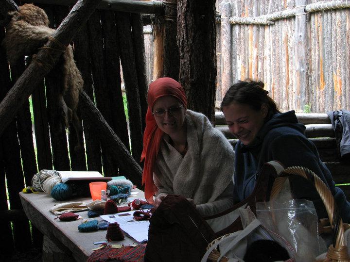The workshops were well attended. The textile manufacturing techniques included developing a deeper understanding of tablet weaving, courtesy of Christina Grünefeld and Miakki Karisto, stone-aged techniques including twining by Anne Reichert, hollow form felting by Sabine Ringenberg, filet netting by Katrin Kania, twined knitting by Viktoria Holmqvist and Nålbinding by Harma Piening. Couched work was taught by Reia Chmielowski. How to make a one-piece shoe was taught by Katrin Koch-Maasing with a preliminary talk on their history beforehand. The social history of shoe hay was revealed by Ellinor Sydberg during a workshop and lecture. The final full day saw an exhibition and sale of items brought by participants and Anne Reichert presented a lecture on stone-age techniques to the public. The workshops took place either in a glass-sided classroom or in the open air in a reconstructed building. This meant that they were open to the public, who stood back but freely asked questions, and so added to the life of the museum.