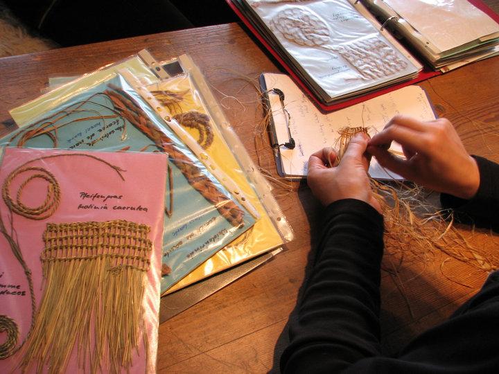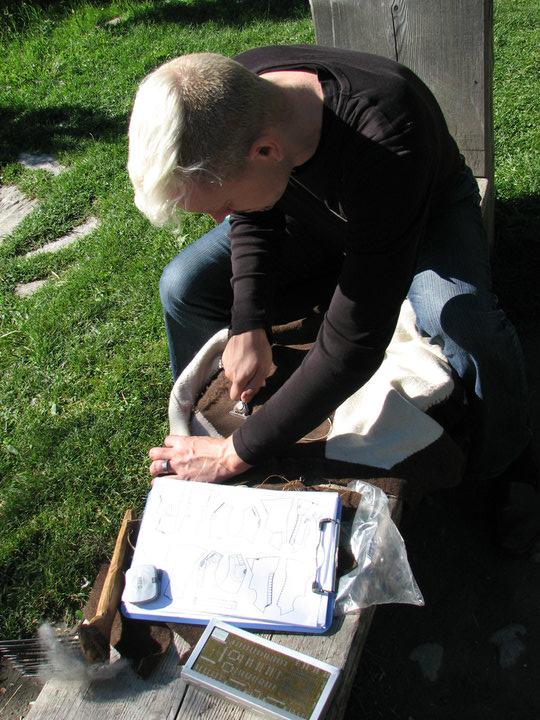 This year’s Textilforum had a more formalised timetable. The mornings were free for discussion and the practising of new techniques. The afternoons saw a series of workshops and a programme of lectures were held in the evenings. The first lecture was the outcome of the spinning experiment last year, presented by Katrin Kania. A number of delegates had been awaiting the presentation with keen anticipation! On successive days lectures were given in twined knitting by Viktoria Holmqvist, stone tools for fibre preparation by Linda Hurcombe, stone-age fibre techniques by Anne Reichert and the recreation of the clothing of Gunnister Man by Martin Ciszuk and Lena Hammarlund. Each of these lectures was well received. The study of the Gunnister Mann was interactive: to recreate the clothing accurately it was necessary to create new garments then to destroy them in the same way as the originals. Martin Ciszuk, a tailor who specialises in historic reconstruction, took to this task with a meticulous thoroughness that was much admired. An open discussion was held on the penultimate evening asking, what defines a textile? There was a vast difference of opinion and it was felt that to define such a broad question too closely would cause a loss to the subject as a whole.
