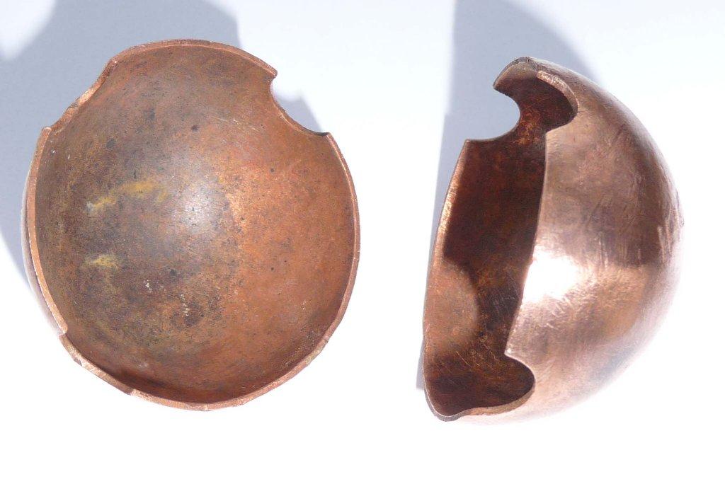 The experiments with making clay and plaster moulds have shown that each mould takes a minimum of one hour to make and has a very short life. It seems the out-lay of 54 minutes plus the cost of copper (it can be made from any scrap) is a worthwhile return on the investment. The hemisphere design is made from a single piece of metal and is very simple. If a different shape was required then a punch of that shape could be made in either metal or even hard wood. It would be hammered into a lead block thus producing a die. The sheet metal would be placed in the die; the punch would then be hammered onto the metal driving it into the die and forming the shape.