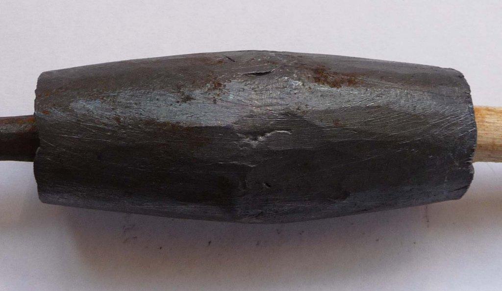For a long period the method of casting the lead onto the wooden shaft was the topic of much discussion. The difficulty was that it was assumed that when liquid lead was poured onto the wooden shaft it would burn the shaft through, thus making the weapon useless. The current author has shown that the casting of lead onto a wooden shaft is a simple and straightforward operation, well within the skill set of any metalworker or armorer (Sim 1995).