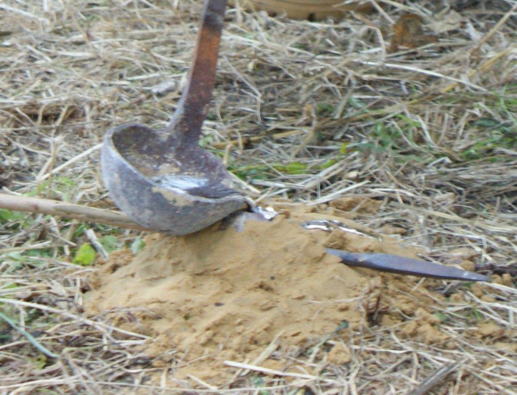 There is no necessity to clamp the two halves of the mould together for casting. The metal is poured in slowly and, provided the mould is packed tightly into the sand or earth surrounding it there is enough to hold the two halves together.(See Figure 16 and 17)