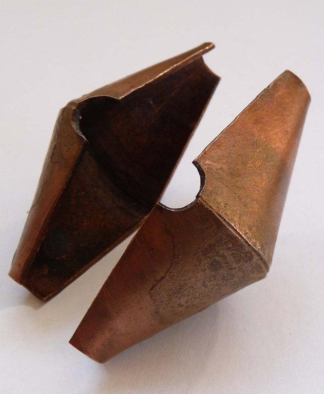 It is possible that the weights made from a double frustum could have been cast as a cylinder then hammered to shape. The mould shown in Figure 13 was made from a single piece of sheet copper. (See Figure 13, 14 and 15)