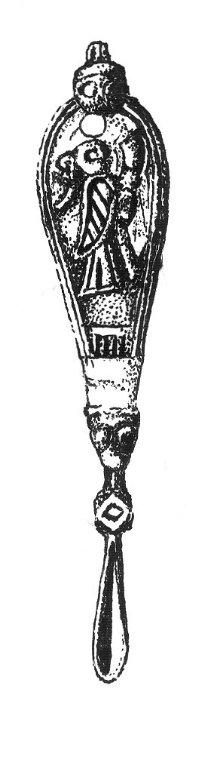 Since wax used in the lost wax-process generally vanishes away by fumes, we have to look for characteristics caused by the method in the cast objects. The only Scandinavian object I know so far that is obviously a lost wax-cast piece, is a silver ear-spoon from grave 507 at Birka (See Figure 2). It is a small, gilt piece with niello-inlayings. The backgrounds of the figures on the handle have rapidly been modelled with an approximately 1.5mm wide chisel, which has left very charachteristic marks of cutting through wax.