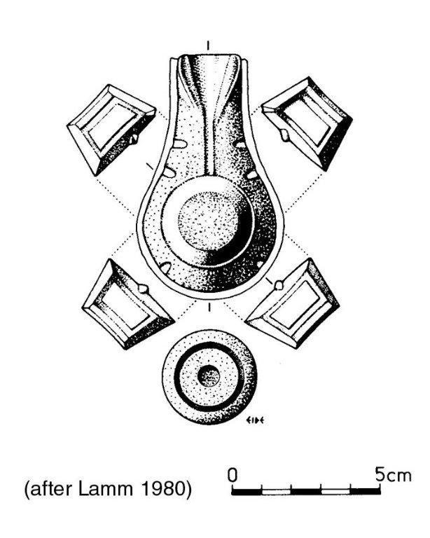 The clasp button-moulds would, according to Lamm, have been divided into six or rather seven parts (Lamm 1980,107f), as shown in Figure 5. The parts would have been modelled around the original object and taken apart in order to remove the original, whereupon they were put together and connected by an outer layer of mould material. This is a direct matrix-method. Concerning lost wax-casting, Lamm says the use of this method cannot be proven with any certainty in this material (Lamm 1973,3).