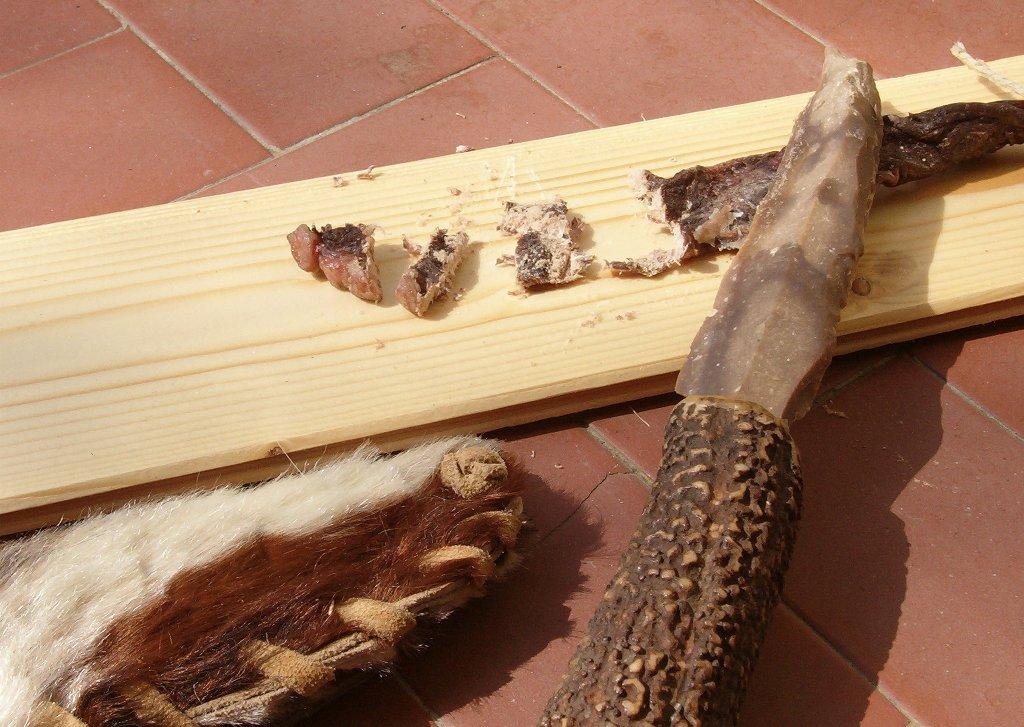 The analysis conducted on the samples demonstrated a good edibility of dried meat that meets the current European Regulations for healthy food. The product was consumed by the author. It was odourless, stringy, greasy and almost tasteless. The colour was reddish brown, with a texture similar to leather. The thickness was very small compared to fresh meat, making it easy to cut with a knife of flint. The meat broke almost like a biscuit. Chewing was difficult and the author needed to soften it in his mouth, which required a lot of work the jaw muscles. It 's likely that in the past the meat was rehydrated before being consumed.