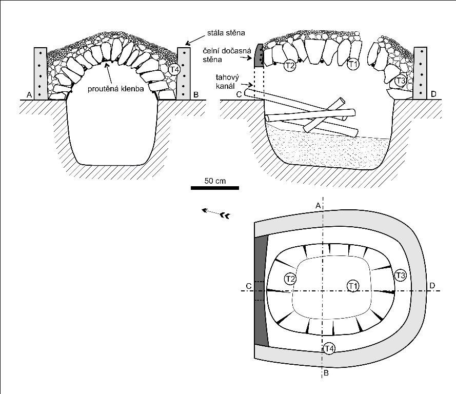 The feature that inspired the experimental kiln had an oval plan. It was 1.3 m long and 1 m wide, and it had a flat bottom slightly sloping towards the north. The maximum depth was 0.7 m, with a volume of 0.7 m3. Most of the infill consisted of two types of daub. The top was mostly filled with large blocks of this material. The surviving surfaces carried traces of smoothing by hand and were mostly flat. At the bottom there were daub fragments with numerous imprints of armature, the surface was covered with imprints of fists. At the complete bottom of the kiln there was a compact layer of a greyish-white ash mixed with a small amount of daub. The bottom was mildly burned to a depth of, at most, 2 cm, stronger on the south side. The burning of the sides strengthened towards the top and reached a depth of 10 – 14 cm, evenly along the whole circumference of the feature.