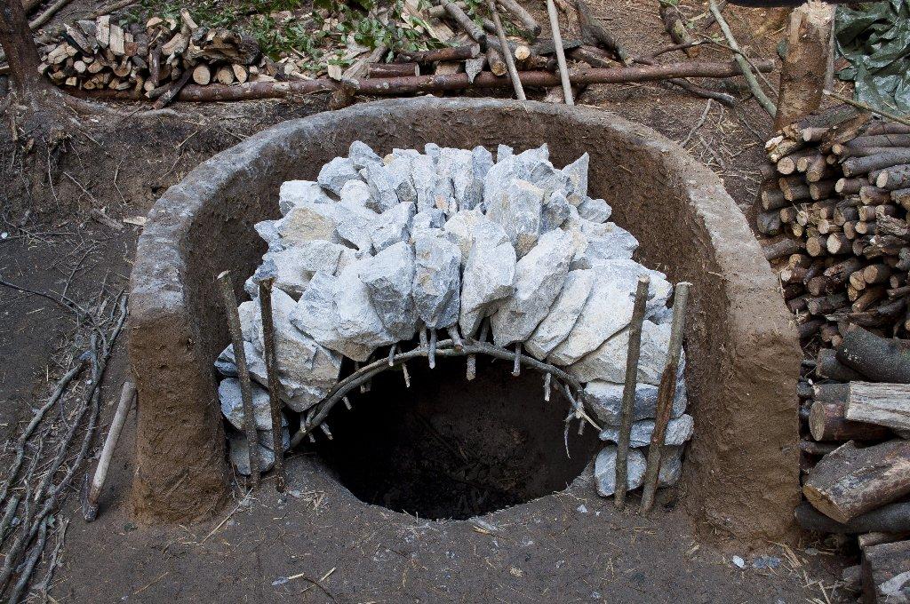 The primary aim of the next burning was therefore to adapt the loading of the kiln to allow for a better circulation of air throughout the whole load. The first layer of fuel was therefore stacked in a grate manner. Vertical rods were placed in the area of the drawing eyes (See Figure 6). These were pulled out after loading of the kiln, which left vertical channels leading from the lower fuel layer up to the surface of the load. All together we used 500 kg of limestone, 130 kg of gravel for insulation and 200 kg of wood. The temperatures in the centre of the load reached a maximum of about 950°C after 4 hours (See Figure 5B: T2 and T3).