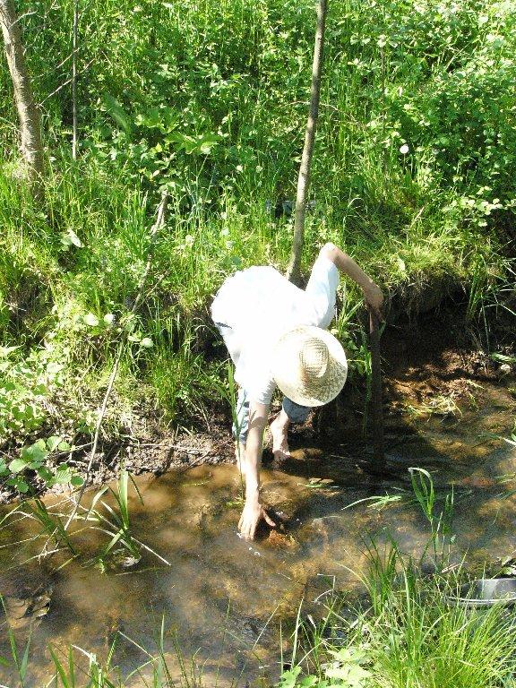 We had only the necessary tools for iron smelting and forging, three cubic meters of firewood and the goal to produce forgeable iron blooms by the end of the camp. During the first days of the camp charcoal was burned in a charcoal pile for the bloomery and forging process, and we collected bog iron ore from the nearby iron ore deposit found in a brook (See Figure 3).