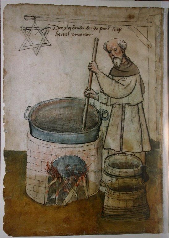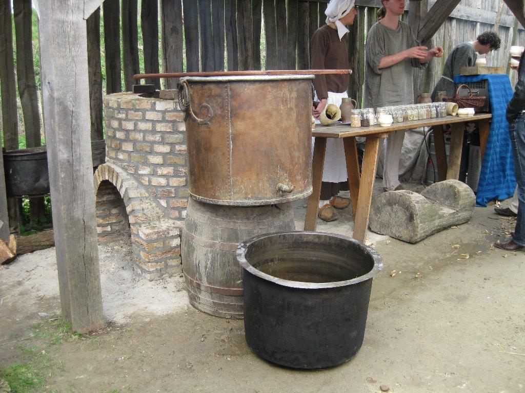 You need suitable equipment and it must be kept clean, or the ale will spoil. Typically, the brewer uses five to ten times as much water in washing the mash tuns and fermentation vessels than is turned into ale. Therefore, substantial drains are essential. You also need large containers for hot water and these can be metal, wood or even a wood-lined trough in the ground. The mash tun is used to heat crushed malt and water to make liquid fermentable sugars, the wort. What the mash tun is made of dictates how the water and the mash is heated. For several years Huib van der Stam and a group of brewers have re-created mashing, medieval style, at Eindhoven Open Air Museum (See Figure 2). They used a cauldron for mashing, a lauter tun to separate the wort from the mash and jugs. The brick mash oven is based upon illustrations in medieval manuscripts (See Figure 3).