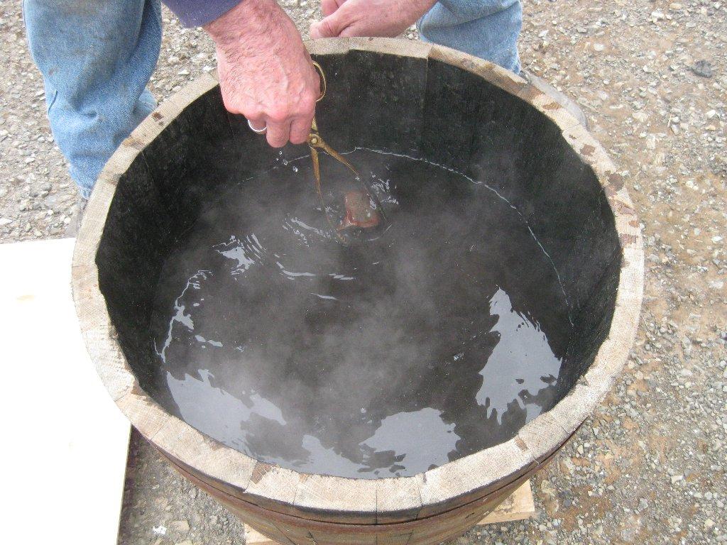 Malt contains very little sugar, but it does contain starch and the necessary enzymes (amylase) that convert starch into fermentable sugars. To make these, the malt is 'mashed'. The malt is crushed to break the husks, then mixed with hot water for about an hour in a mash tun (See Figure 7). It must not get too hot or too cold, about 65°C is perfect (Line 1998). Hot rocks are good at keeping the mash temperature up. As the mash cools, a hot rock or two will warm it up again.