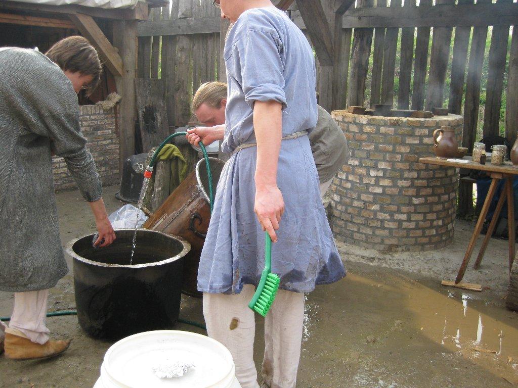 mash using a technique called lautering or sparging (Line 1998). This is a messy process involving hot water, sweet sticky liquids and the transference of liquid and mash from one vessel to another. The wort is boiled with herbs to flavour and preserve. There are traditions of using a variety of herbs and plants, as well as filtering the wort through juniper branches. Then it is fermented into ale and stored in a vat or barrel. There is inevitably spillage and, unless there is adequate drainage for washing this away, things quickly become very messy (See Figure 8).