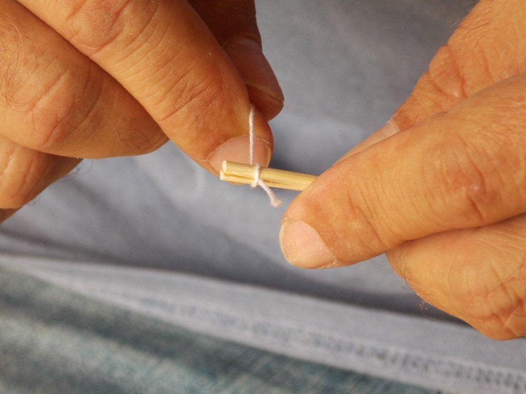 After the dart has been tied, you want to shake off the excess material. To do this, spin the shaft between your palms quickly and any excess material should spin away. Do this outside because it can cause a mess if you did not get your material on your shaft.