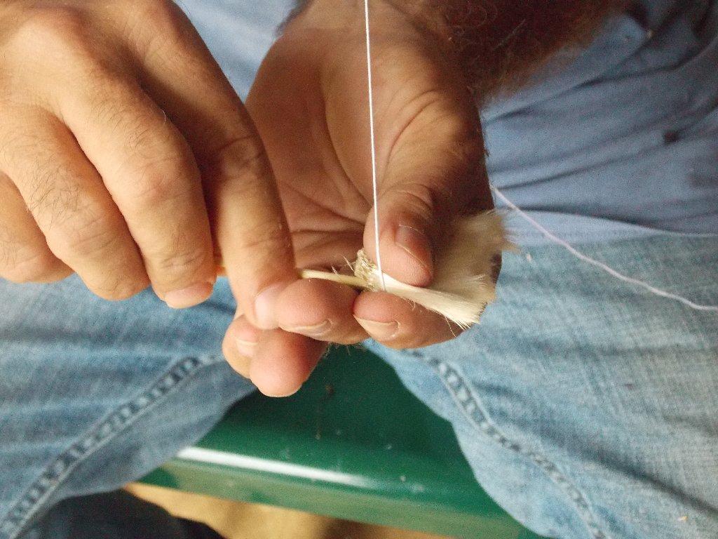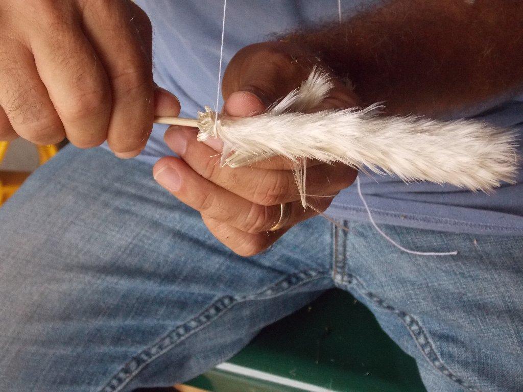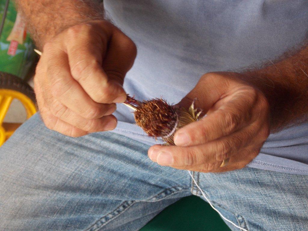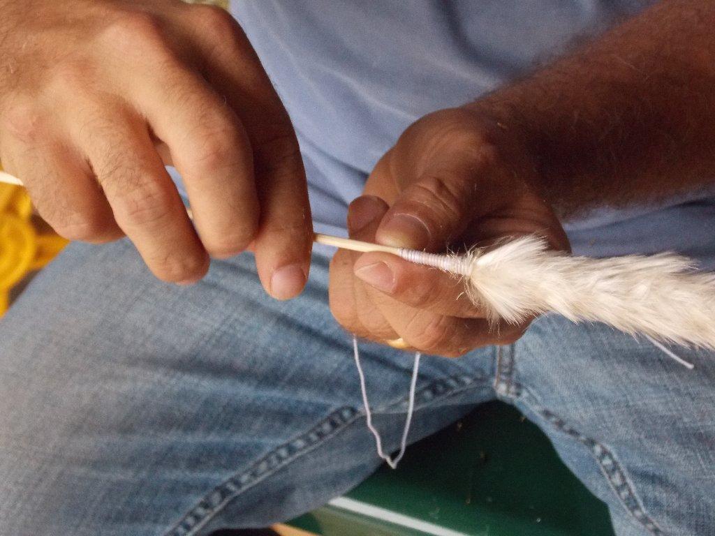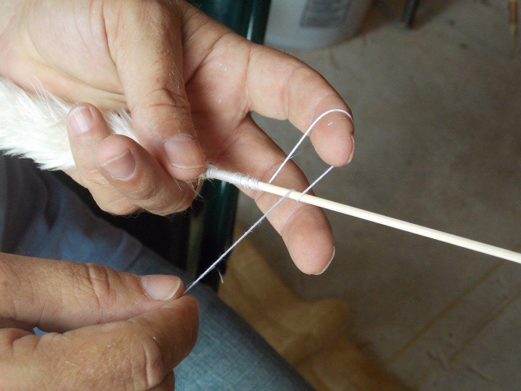 Over the years, I have learned that the actual rolling is a hard concept for some people to grasp. You are attempting to make a continuous spiral of thistle down and string along a three to five inch length of a dart shaft. People either move the shaft too fast or do not catch enough thistle filament on the dart. These darts either end up looking like plucked chickens or the filament is tightly packed in about an inch and one half of the back of the dart. Practice is the key. Once you realize the balance between shaft and material, you can tie darts using inferior materials.