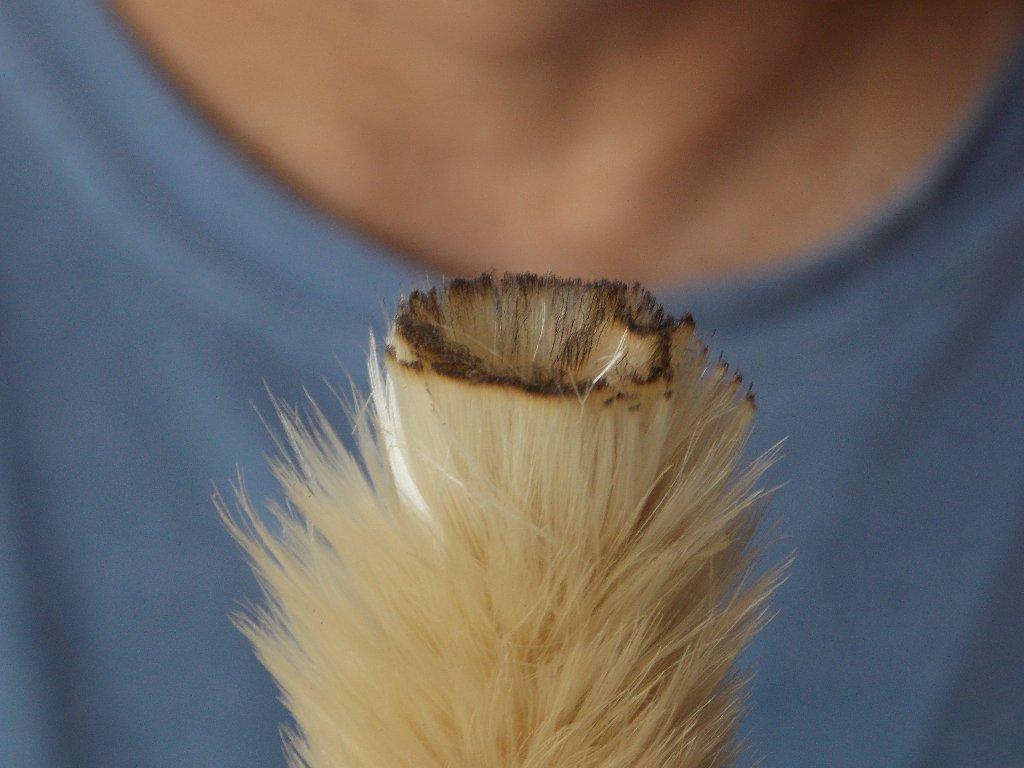 The anther should be pulled out carefully because the anther is intermixed with the filament. The filament is the part of the thistle you will fletch your dart with. The filament is an off-white colour and will be exposed when you have the entire anther removed. If you do not pull out the anther carefully, you will lose your filament and have less material left to fletch your dart with. Any anther left can be picked out when the dart is finished.