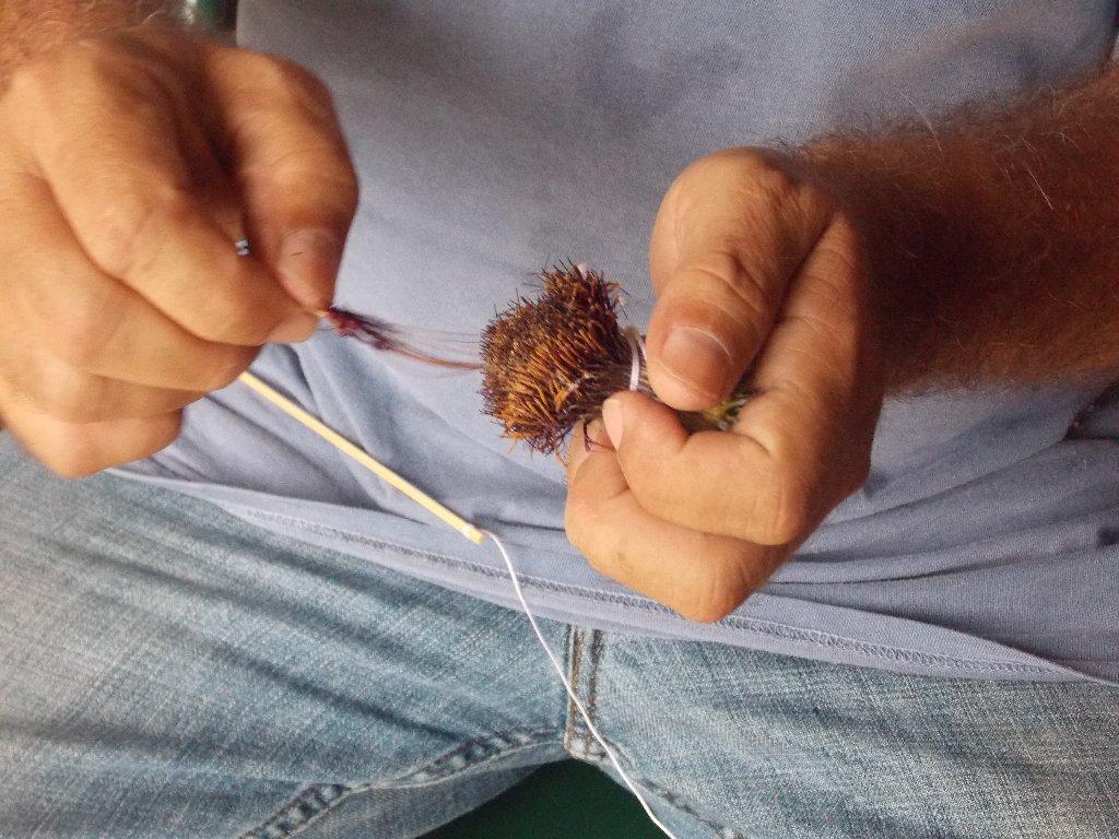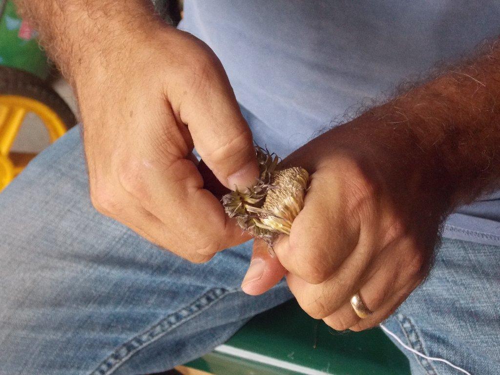The first step in preparing your thistle for dart rolling is to hold the dried thistle head in your left hand and begin pulling out the anther. On a dried thistle head, these will be brownish purple or yellow and come out easily. If the anther does not come out easily then you usually have an insect larva in your thistle cap. The insect larvae are usually dead and have mildewed inside the cap causing the anther to stick. If the anther does not come out easily, I leave it in and either pick it out after the dart is rolled or leave the fibres in for a dart decoration.