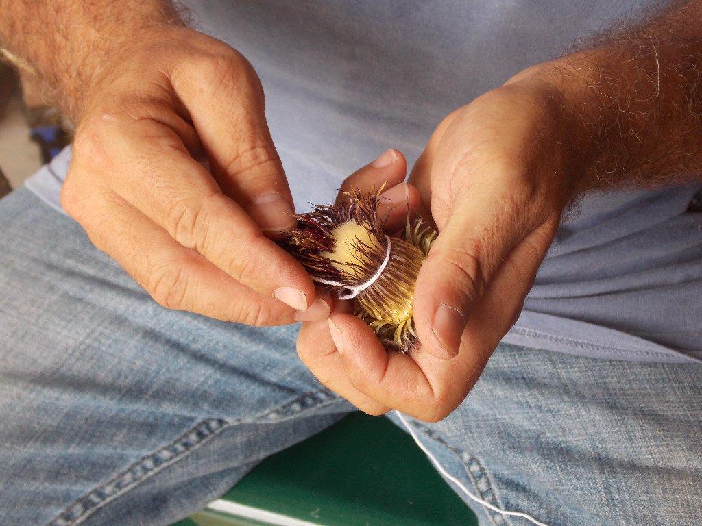 As I prepare to remove the sepal, I used my thumb to push the filament circles down to expose the sepal better. I pinch the sepal leaves between my thumb and index finger and carefully pull out one or two at a time. Be careful to barely release pressure with the hand holding the thistle head or you will pull out useable filament. This is the stage where most beginners start to lose control of their thistle head. Remember, if you leave some sepal on the outside you can pick it out easily from the finished rolled dart.