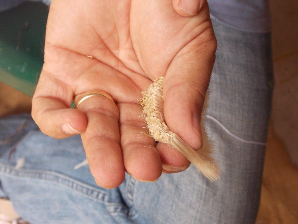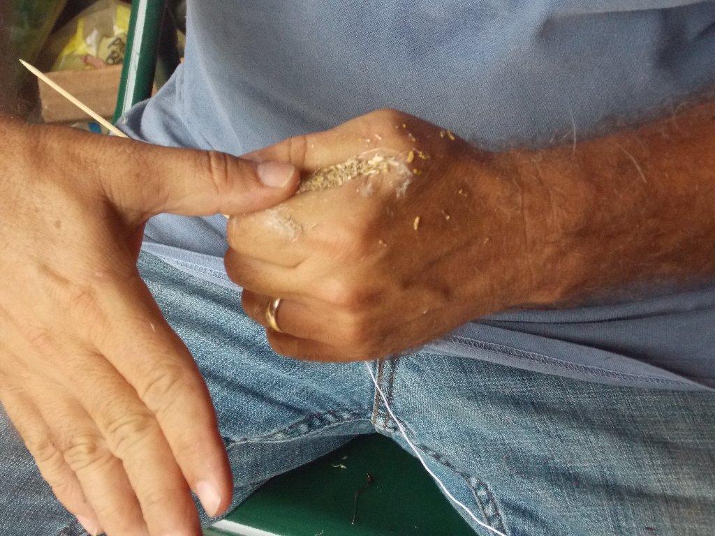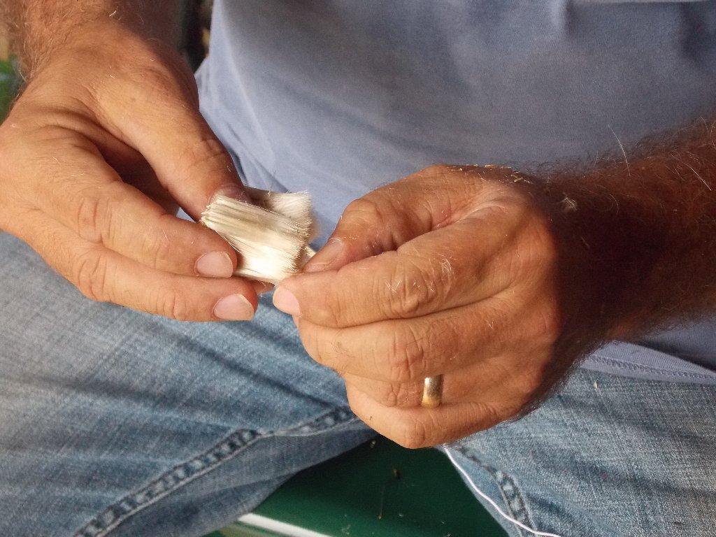 Now take your thumb or index finger and briskly rub it across the stamen circles to break them up and release the filament. This rubbing crushes the stamen circles and separates the filament to be used for rolling the dart. I usually squeeze the filament hard so my hand generates sweat. This moisture and compression briefly keeps the filament together so you can turn the filament around in your hand. You want the seed side of the filament facing your left palm so that it lies against the shaft when you are rolling the dart.