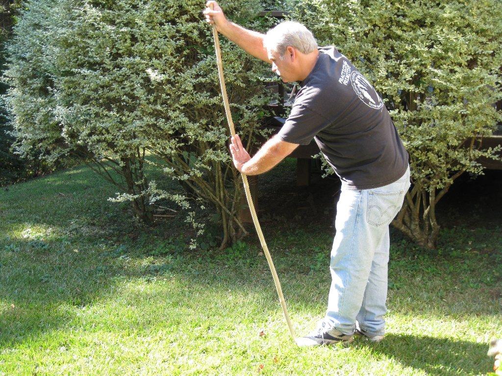 I use two straightening techniques. The first technique is to bend the cane over my knee. From a sitting position, I can use both hands to put slight pressure on the cane. This works well for specific areas. For general areas, I stand up and grasp the cane at the top and place the bottom on the ground. I push with my other hand to get general overall bends out. I have seen Cherokee blowgun makers intentionally kink the cane to straighten it.