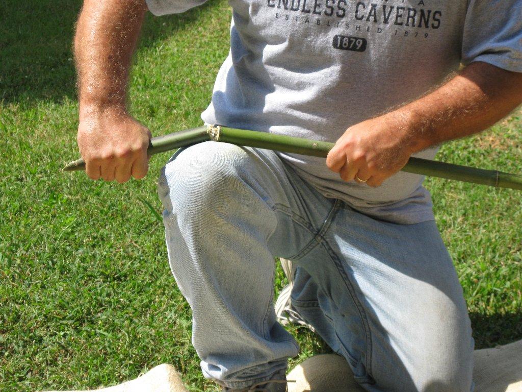 To cut cane prehistorically, aboriginal Southeastern blowgun makers would have probably used a stone flake or stone knives. If you score rivercane all the way around, it tends to snap off. Cut as close to the ground as you can and below a joint. I have cut many cane stalks with aboriginal tools and find them as effective as modern tools. If you are using modern tools, the machete works well unless you are in a thick cane break. When you cannot use your machete safely, use a hacksaw or sierra saw. These saws will cut the cane close to the ground and gives a blunt cut. I have cut myself with the sharp ends left over from a machete cut piece of cane