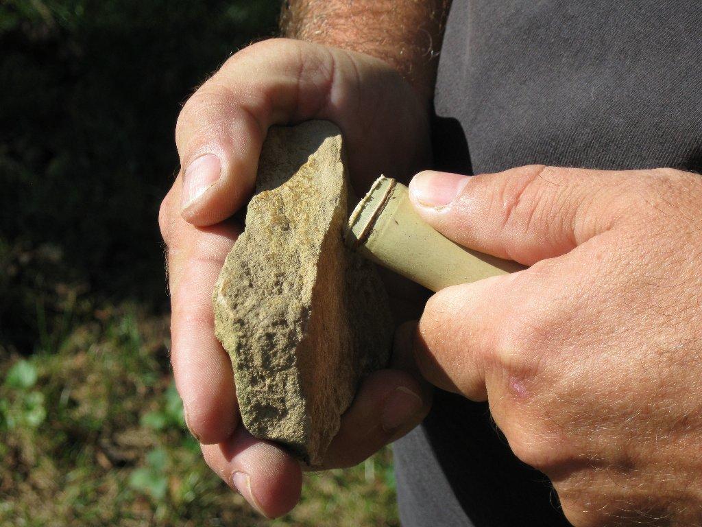 Several early ethnologists suggested that a river cane blowgun could not be made without the use of metal tools (Speck 1938). In 2010, after making blowguns for over twenty years, I decided to experiment and see if I could make a blowgun with all stone tools. First I spent time and carefully selected the straightest piece of cane available and cut the cane with a stone biface. If you score cane and completely cut the outer sheath then the cane will snap off with little effort. By pulling the branches away from the stalk and down you can snap them off by hand. To remove the nodes I made a punch out of a smaller diameter piece of cane. I cut a forty-five degree angle on my punch slightly above the node so my punch would have strength. When green the nodes punched out easily. After the nodes were punched I used the punch as a sanding tool by moving the punch back in fourth inside my blowgun with a slurry of sand and water. The green cane could be flexed straightened across my knee or chest by applying slight pressure. For this experiment I made five blowguns and each blowgun took thirty minutes to make. I believe that someone more experienced than me could cut that time in half (Meyer 2011).