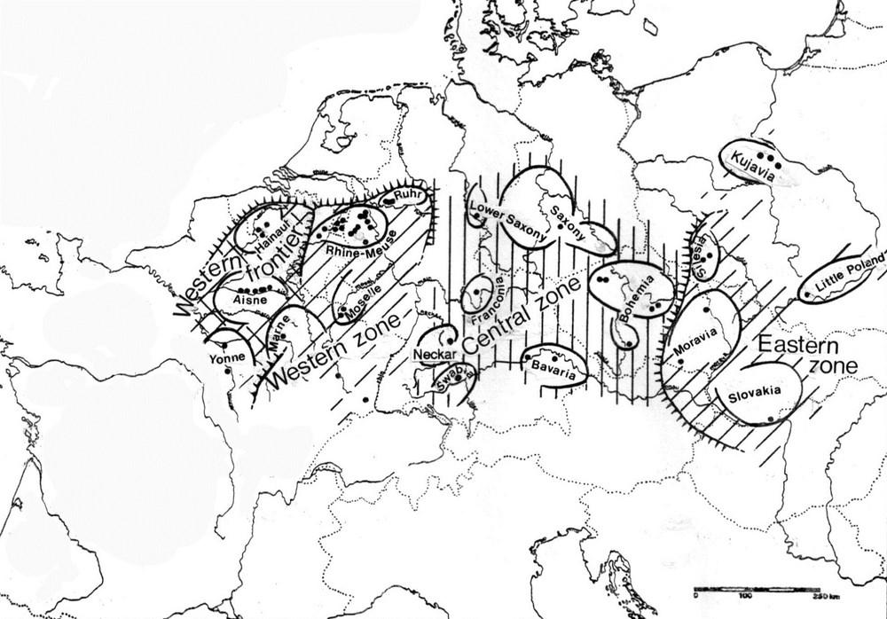 It is on the basis of natural boundaries, archaeologically 'empty' zones and slight differences of a stylistic nature that 'Bandkeramik Europe' has here been divided into four zones, comprising the following regions2 : the eastern zone (Little Poland, Slovakia, Moravia and Silesia), the central zone (Bohemia, Saxony, Lower Saxony, Bavaria and Franconia), the western zone (Swabia, the Ruhr area, the Mosel area, the Rhine and Meuse basins), and the western frontier (the Hainaut, the Marne, the Aisne and the Yonne basins). Finally, Kujavia (Poland) has been included in this study because of the cultural affiliation of the Lengyel groups with the Danubian, but its isolation, its chronological position (Chalcolithic according to Lichardus et al. 1985) and the very considerable cultural differences which distinguish it from the other groups would be arguments to keep it apart.