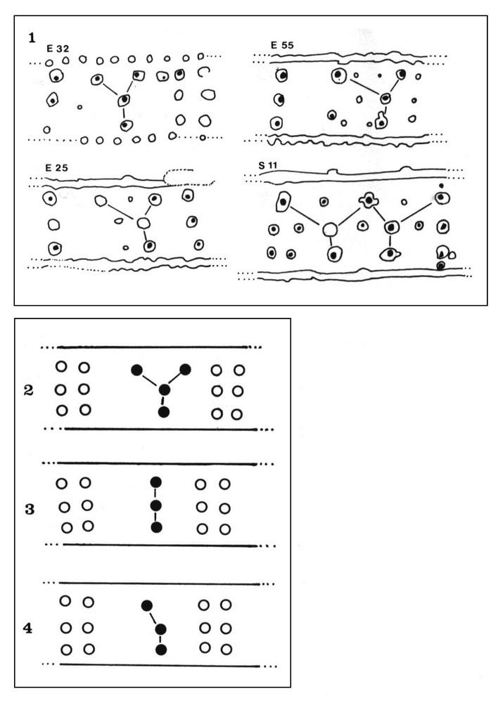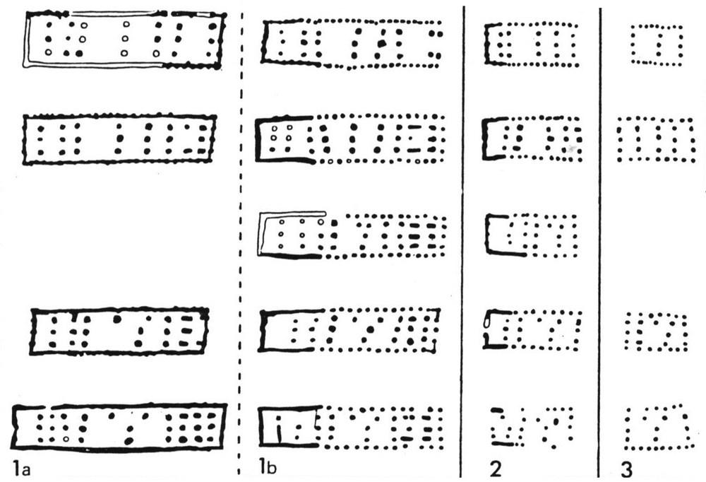 Several kinds of longitudinal linkage have been proposed for Bandkeramik architecture. The simplest one is a system where the ends of two longitudinal beams meet at the head of a post. Soudsky (1969, fig. 13) suggested the existence of a Ï configuration: a beam placed on the top of two vertical posts would have had its two ends protruding (See Figure 8). Unfortunately, this arrangement is not always compatible with the layout and the number of internal cross-rows. These are indeed often too numerous and too close to one another for this kind of construction to be rational and stable. Actually, the number of cross-rows does not follow from a technical constraint, but is instead a response to an idĂ©el necessity. As a matter of fact, the longer the house, the greater length of the longest span between the cross-rows. If the Bandkeramik people could resolve this problem for the big houses, why not for the smallest? On the other hand, the close spacing between rows is always observed in the same locations in the house (See Figure 9). This is particularly the case in what we identify as the separation corridors between the front and middle sections, and between the middle and rear sections of the house. In the middle section, after the first corridor, one also finds two cross-rows quite close to one another. Thus, it was probably the ratios of the distances between cross-rows that were important, rather than the absolute distances themselves. The particular rhythm of this arrangement (âą âąâą âąâąâą âą) seems thus to have been important in the universe of mental representations, at least insofar as the house was concerned (See Figure 9.1e). It would probably not have been retained for so long if it had only been present for technical reasons.