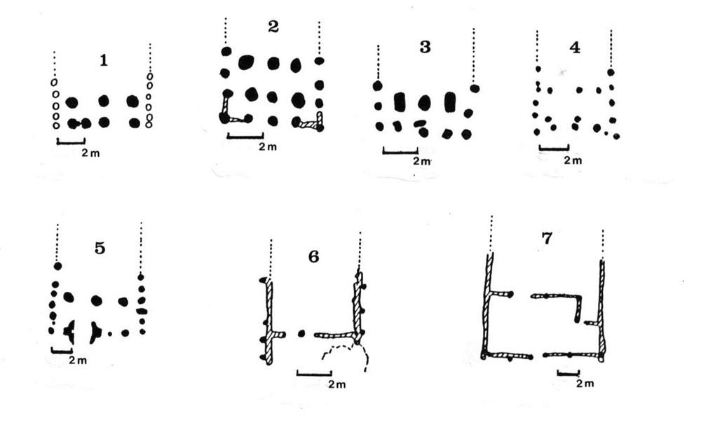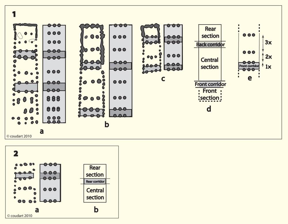 Later, actual changes appeared which sometimes affected the architecture's conceptual model: modification of the internal cross-rows, for example. The holes of the wall-posts are now also a little deeper, or even much deeper, than the interior posts. The pseudo-buttress disappeared but smaller posts (or actual buttresses) were often attached to the walls (See Figure 15.4and 15.5). At this point, one may speak of load-bearing walls. The ratio between the average depth of inner post-holes and of wall post-holes allows us to identify three main categories of load-bearing function: weak, moderate and important. The archaeological data do not allow a closer approximation, but it is enough to know that some walls withstood greater pressure and traction than others.