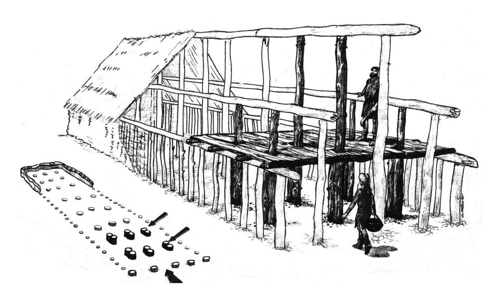 There is general agreement in interpreting the duplication of post-holes found in the front section as remains of the base of a raised floor (See Figure 13) that may have served as a storage area. This hypothesis is corroborated by wheat grains or weeds found in the rubbish pits of those houses that had such a platform (in particular in the Aldenhovener Platte sites, LĂŒning 1982a and 1982b).