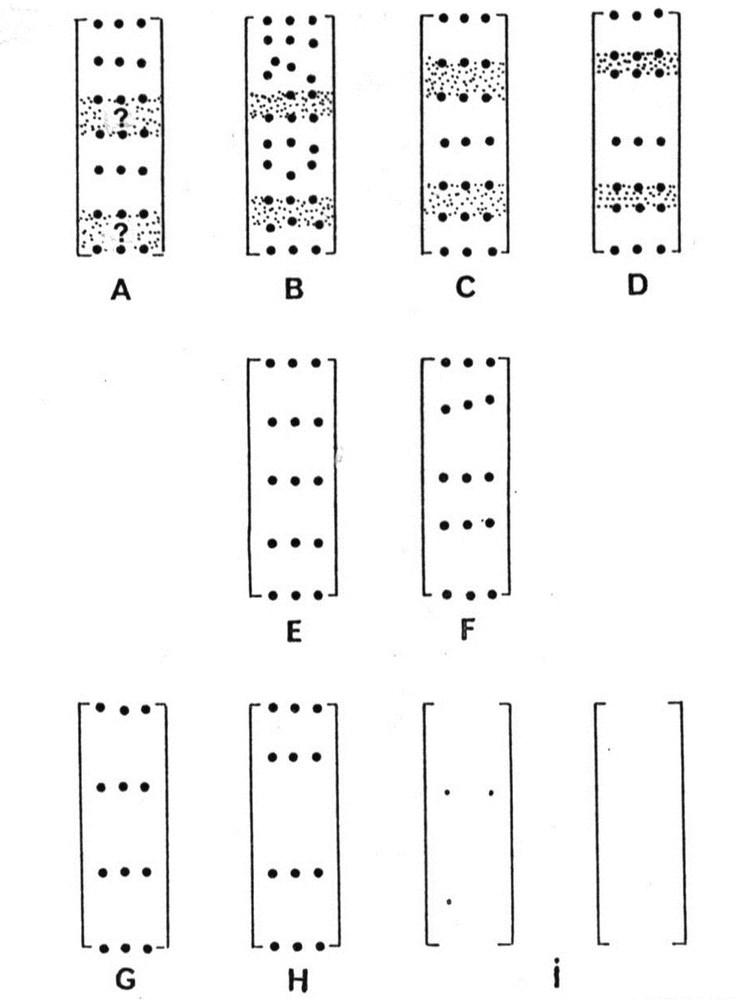 - for the post-Bandkeramik period (in which type G is the most frequent): types E (spaced monotonous pattern); F (spaced amorphous pattern); G (very widely spaced monotonous pattern); H (very widely spaced amorphous pattern); and I (without visible cross-row).