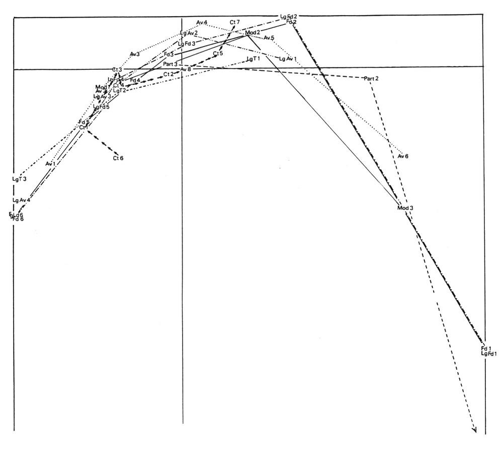Given that certain kinds of variables are linked to the dimensions of the house, and in order to arrive at a general overview of the relationships between qualitative aspects (types) and quantitative ones (different length categories), a correspondence analysis (See Figure 19) has been executed on the following variables: types of front (Av), central (Ct) and rear (Fd) sections, length categories of the front (Lg Av) and rear (Lg Fd) sections, total length (Lg T), Modderman's typology (Mod) and the internal partition (Part).