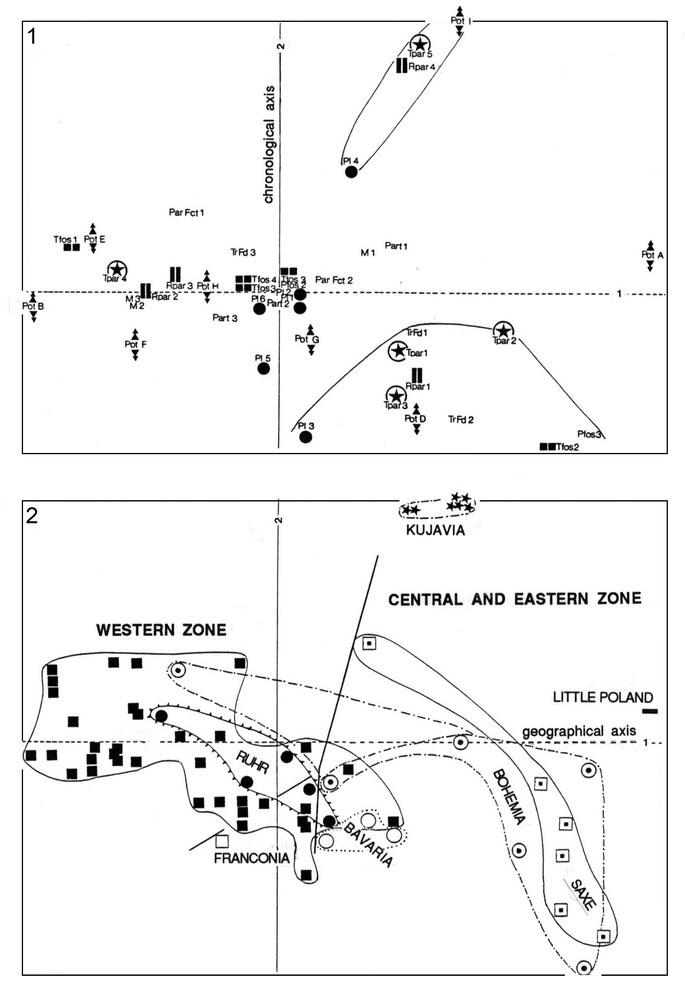 After identifying the characteristic variables of the post-Bandkeramik houses that do or do not co-occur, we have executed a correspondence analysis that presents the following results. Along the horizontal axis, these variables cluster by site and, even better, by geographic zone (See Figure 21). The western zone and the western frontier (negative values) are opposed to the central and eastern zones (positive values). We might say that the horizontal axis is that of the geographic division - from east to west, seen from right to left. The correspondence analysis contrasts the regional assemblages of 'Rhine-Ruhr-Neckar', 'Saxony-Bohemia' and 'Kujavia'. On the vertical axis, there is clear evidence of the survival of ancient characteristics which, dating from Bandkeramik times, still exist in certain areas in the central-eastern zone (Zwenkau, Libenice, Dresden-Prohlis, Mseno) during this later period. Chronologically, the sites of Hienheim in Bavaria, Schwanfeld in Franconia, and Hambach 260 in the Rhineland would therefore be situated in an intermediate period. And, finally, the sites of Kujavia are indeed the most recent.