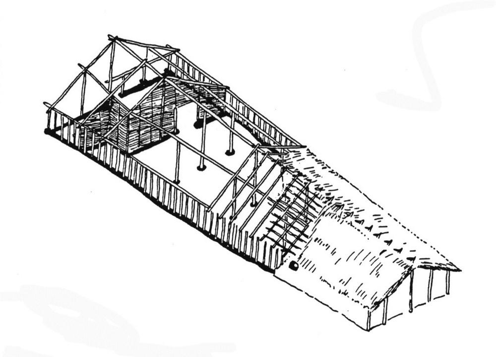 The Bandkeramik house is a longhouse - between ten and forty metres long - with pits dug along its long sides. Its load-bearing structure consists of uprights, grouped in cross-rows of three, perpendicular to the longitudinal axis of the house. In the majority of cases, the space in the building is divided into three sections, namely a front, a middle and a rear section, separated from each other by corridors which consist of two cross-rows close together (see below).