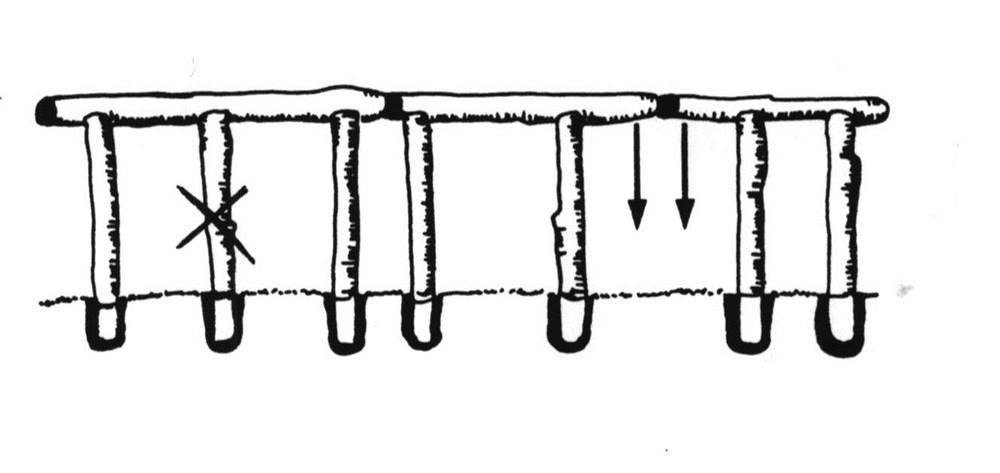 Such a solution assumes, however, that the wall be is tied to the roof because, in our windy climate, a screen wall without any shear wall would have been contrary to the fundamental principle of Bandkeramik architecture: total cohesion between all the elements of the construction. Actually, the cohesion provided by wattle-work replaces the shear wall. This is an efficient solution because it allows flexibility, where the whole absorbs the distortion of any part. Indeed any disjointed element would constitute a point of fragility.