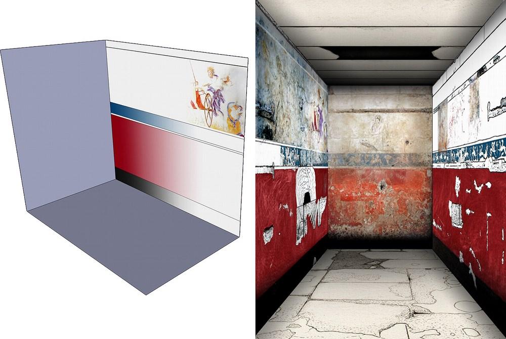 - It is also necessary to compare the work either directly or through photographs and pictures, with other works of art from earlier, contemporary and later periods, in order to identify iconographic parallels as to the attitudes of the figures and the use of colour, as well as to evaluate other versions of the same composition. This process will eventually assist in viewing figures of the mural which are very damaged, such as the Fates (Moirai) and the horses. In order to approach the way the ancient painter wasthinking and to compare the choices he had during the composition, it is also useful to look at artworks with the same subject from the later - post-classical andpre-modern - History of Art. It should be noted here that knowledge of image editing programs is required, in order to create graphs, pseudo-three-dimensional and three-dimensional reconstructions (See Figure 3). All these, of course, do not exempt the researcher from the classic construction of a small scale model (See Figure 4), for the study of the working conditions of the ancient craftsman.