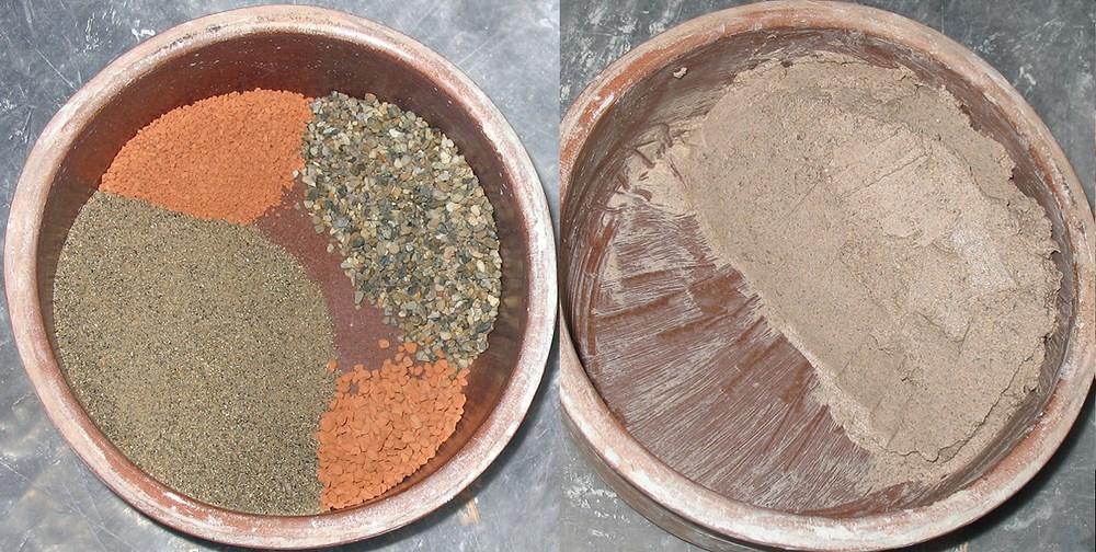 Experiments are also conducted with thecolours: both combinations of colours and pigment ratios in relation to the type of binder: such as boiled rain water, clear lime-water, lime emulsions (lime milk) et cetera.Additional experiments are also included, such as baking pigments and the construction of brushes, which bring the researcher closer to the actual experience of the ancient craftsman. The recording of all experiments must be done accurately and honestly.