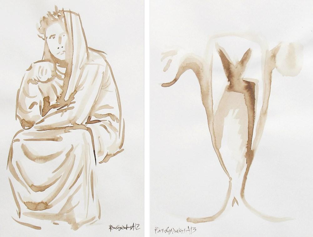 The conductor of such a project can gain experience with the materials both through the construction of the samples-experiments andby practicing with a quantity of lime mortar (See Figure 6) onto plasterboard. This includes painting on a layer of dilute emulsion of lime on the same surface, to increase speed (dilute lime milk dries very quickly on plasterboard). Practicing with another material in order to get used to painting the figures of the mural is also included in the preparation. In our research we use a type of ink (stain), called cassia (See Figure 7), applied on a vertically placed but not well supported paper, in order for the hand of the artist to become accustomed with pressing the brush more gently on the painting surface (sincecontemporary painting materials and supports encourage more ‘harsh’ applications of paint).