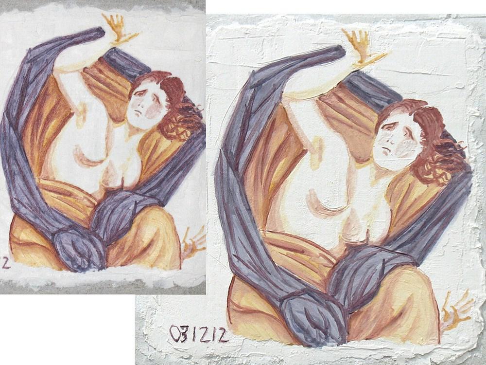 The scholar shouldbe very cautious, however, with the several misconceptions existing in literature. For example, sincea fresco can be executed evenon a single layer of lime mortar 1 cm thick (Mugnaini et al. 2006; Merrifield 1846, 61-68; Palladio 1733. Also, sample experiments of our research with only one layer 3-6 mm thick: 8512 Griffin, 8612 Middle Fate, και 11812 Horse.), the total thickness of the layers in the mural of the abduction of Persephone - approximately 3.5 cm - cannot be considered too thin for the fresco technique (Brecoulaki 2006a, v. 1, 94: “Et si l’on considère l’épaisseur très faible des couches préparatoires sur la « tombe de Perséphone », on sera amené à mettre en doute l’exécution de ses peintures avec la technique de la fresque” "And if we consider the very low thickness of the preparatory layers on the "tomb of Persephone", we shall be led to question the execution of these paintings with the fresco technique"). Myths concerning the technique should also be avoided, such as the claim that the artist does not know what the colours will look like when they dry. It is certain that he knows, either because he is experienced, or because he can experiment with the colours on a piece of gypsum, or on a piece of ceramic onto which a thin layer of lime was previously applied. - The collection and study of the literature leads inevitably to the creation of a ‘recipe book’, which includes earlier, pre-modern and modern‘recipes’. Without the descriptions of the process and a ‘recipe book’ one can neither define the versions of the technique (in order to justify the application technique finally used), nor learn the proportions of materials (which are absolutely necessary and strictly adhered to). There are many ways to execute even the simplest ‘recipe’, so the choice of the final manner of execution used must be justified. The painter of the tomb of Persephone worked under different conditions (closed atmosphere, light and air only from above) from the painter of the tomb of Philip (Saatsoglou-Paliadeli 2006; Saatsoglou-Paliadeli 2004; Saatsoglou-Paliadeli 2002, 101-104; Andronikos 1984, 97-119; Andronikos 1977, 10-39), and the painter of the tomb of Kazanlak (Shivkova 1974; Micoff 1954; Pollitt 2004, 245-246), who both worked in a completely different environment. Even if they all had used the same ‘recipe’, the application method and time they had to complete their work probably differed considerably.